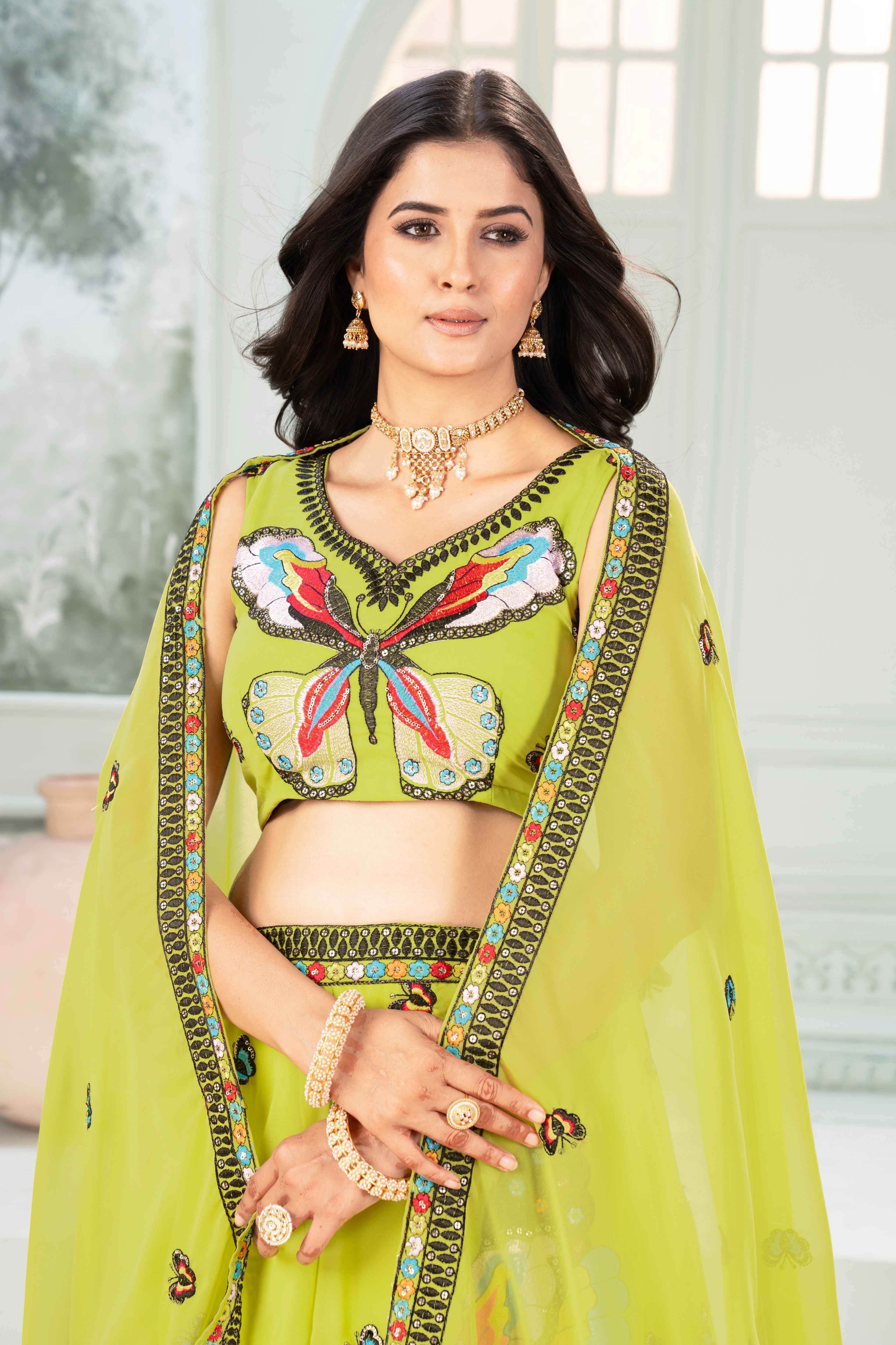 Make a bold and playful statement with this lime green lehenga, featuring vibrant butterfly embroidery and colorful threadwork. Paired with a matching blouse and a sheer dupatta, this lively ensemble is perfect for festive celebrations and summer weddings.